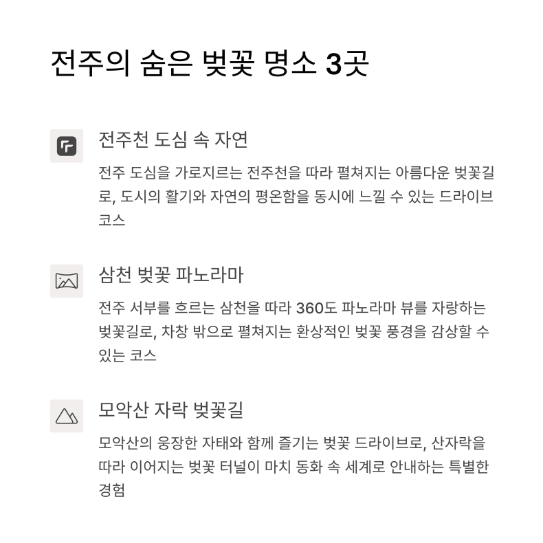 | 전주천, 삼천, 모악산 등 다양한 코스 존재 | 보문호, 암곡터널, 대릉원 등 명소 가득 | 3월 말~4월 초, 남부부터 중부로 진행 |