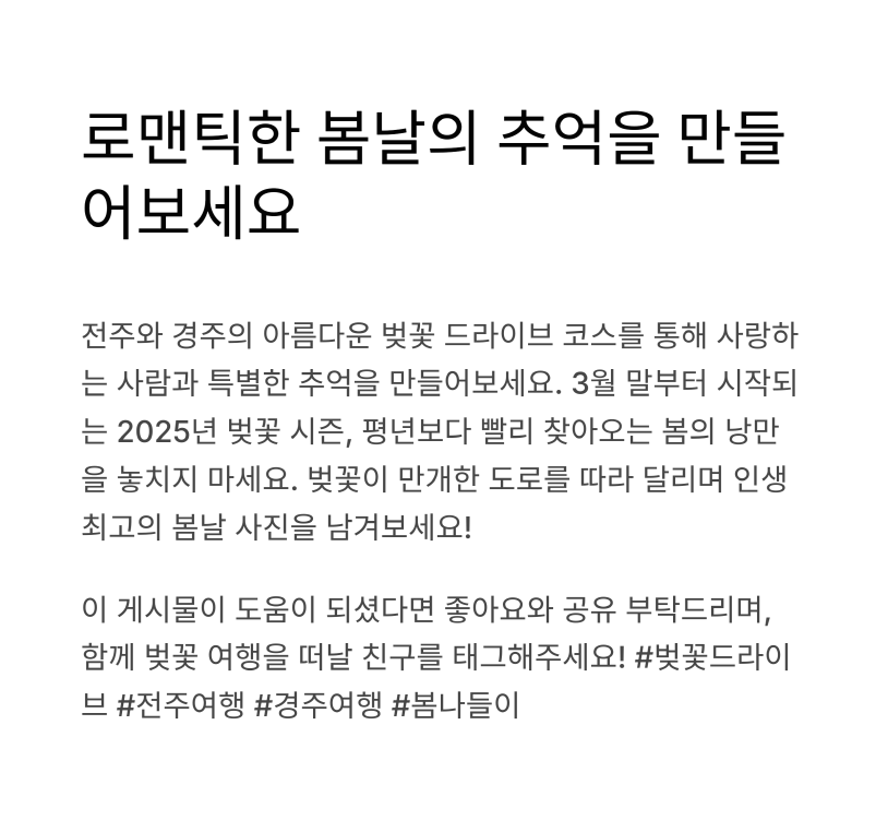 이 글을 통해 소개해드린 드라이브 코스와 축제 정보가 여러분의 여행 준비에 도움이 되었길 바라며, 아름다운 벚꽃길에서 사랑하는 사람과의 소중한 추억을 많이 만드시길 바랍니다.