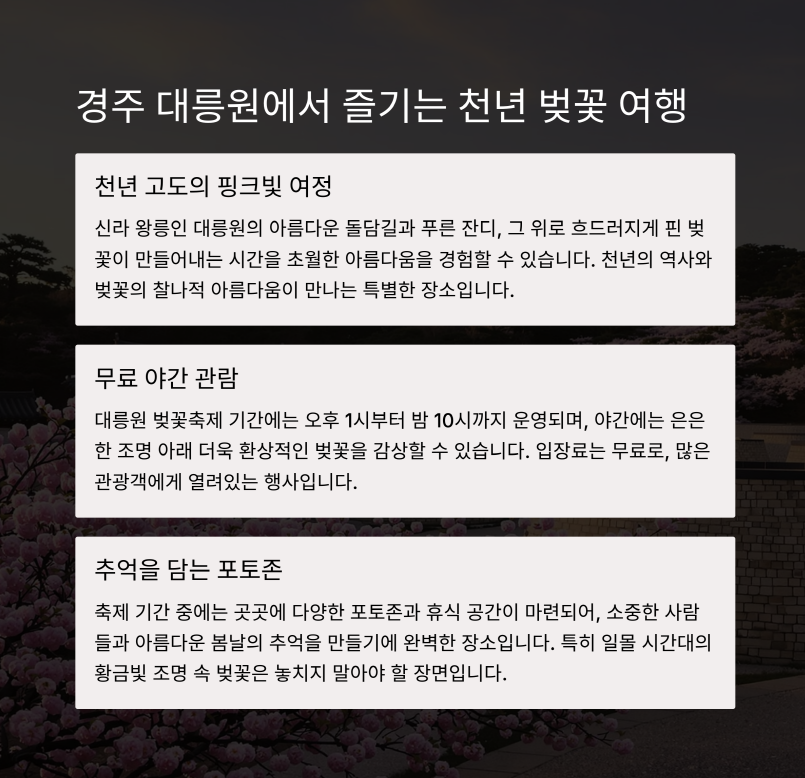 암곡 벚꽃터널과 내서로는 비교적 한적한 분위기에서 꽃놀이를 즐기기에 좋은 코스이며, 불국사공원과 대릉원 돌담길은 고즈넉한 풍경과 벚꽃이 어우러져 한국적인 정취를 느끼게 해줍니다.