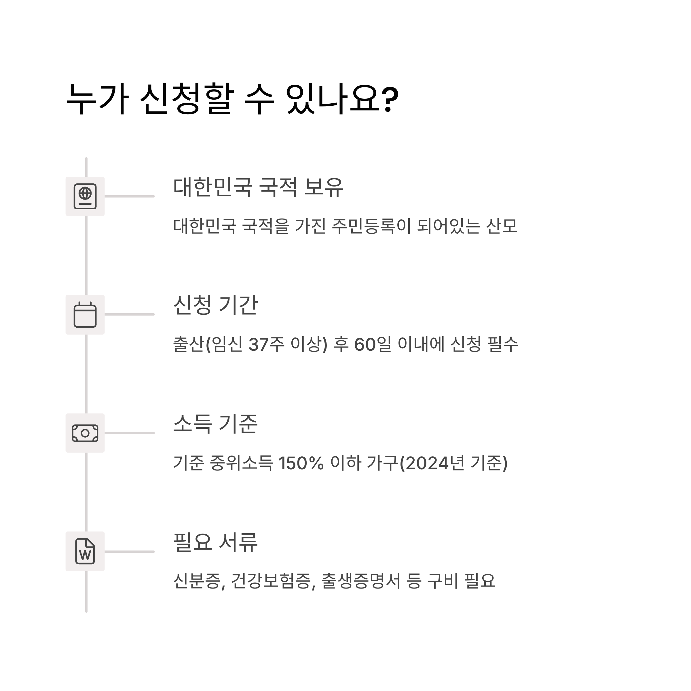 주요 자격 요건은 출산 후 일정 기간 내에 신청해야 하며, 기초생활수급자 또는 차상위계층에 해당하는 경우 우선 지원을 받을 수 있습니다.