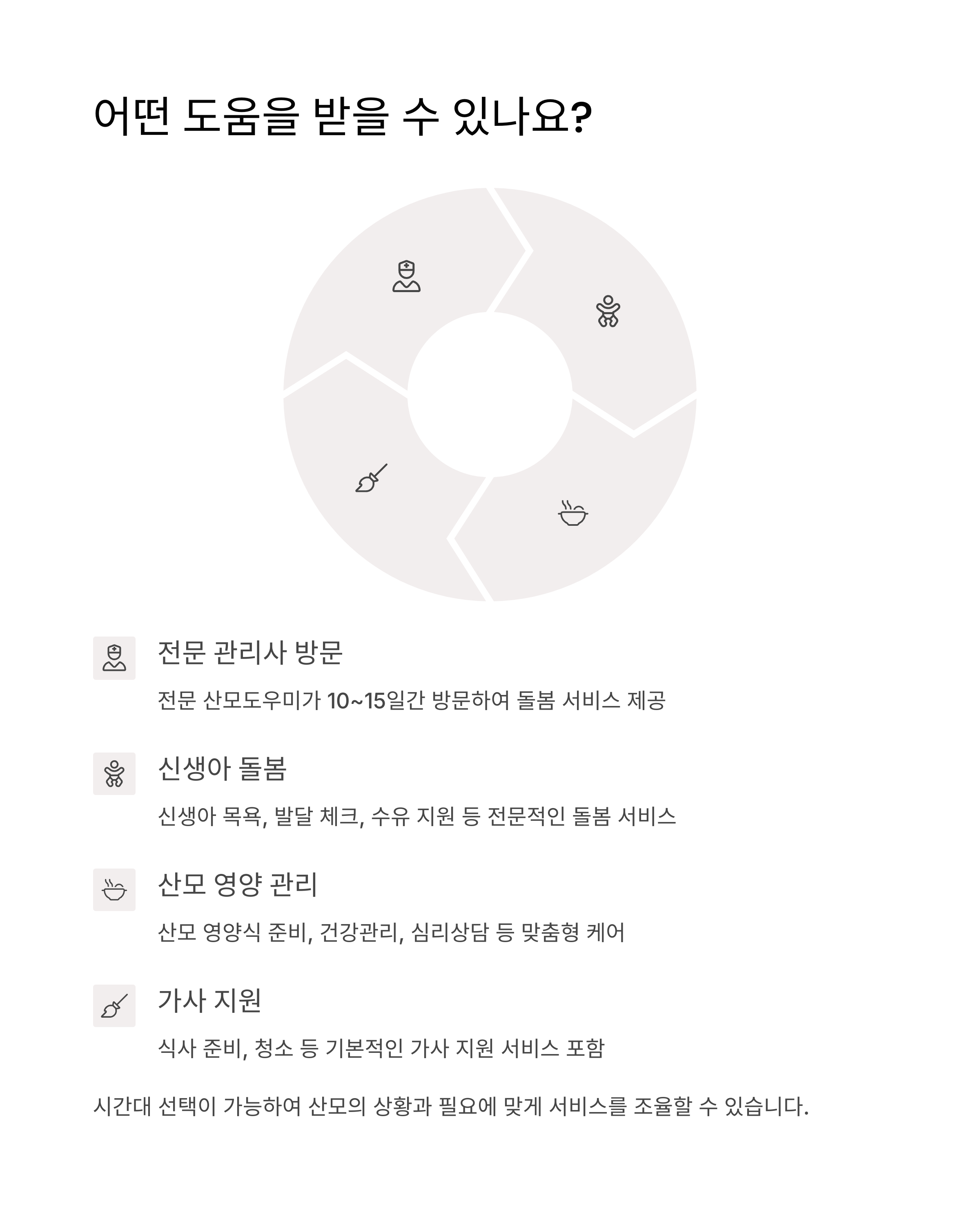서비스는 산모의 신체적 회복뿐만 아니라 정신적 안정을 돕기 위해 여러 가지 지원을 제공합니다.