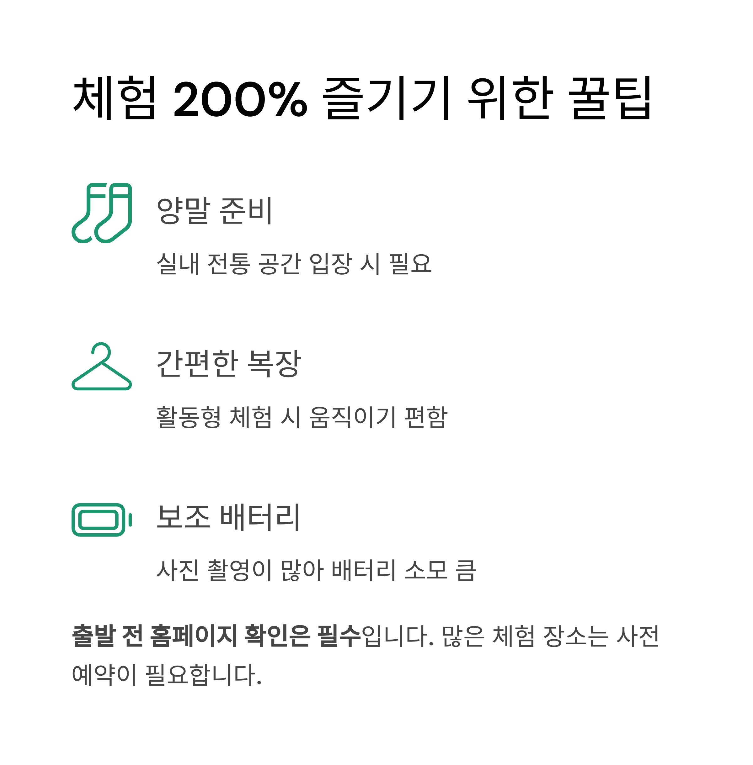 실제 체험 시 준비하면 좋은 꿀팁을 정리해봤습니다.