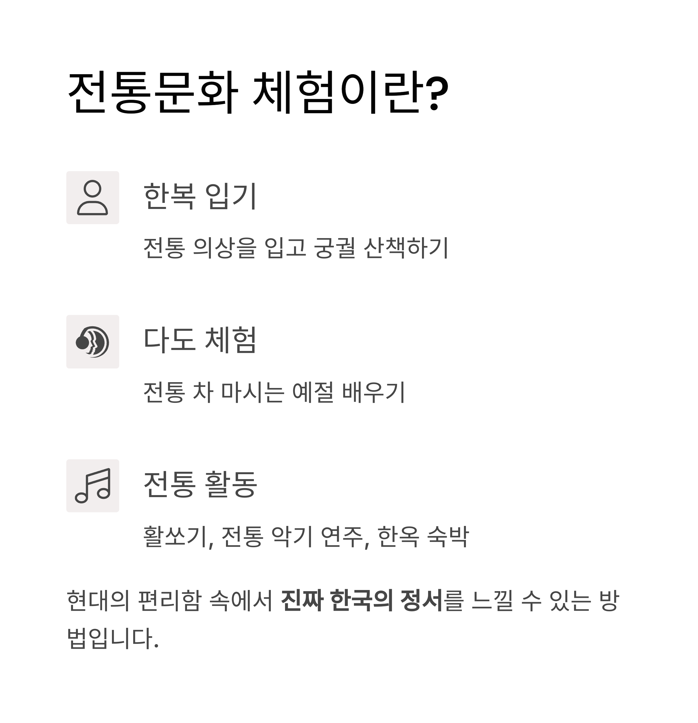 "직접 해보고, 입어보고, 맛보는" 실감형 문화 여행입니다.